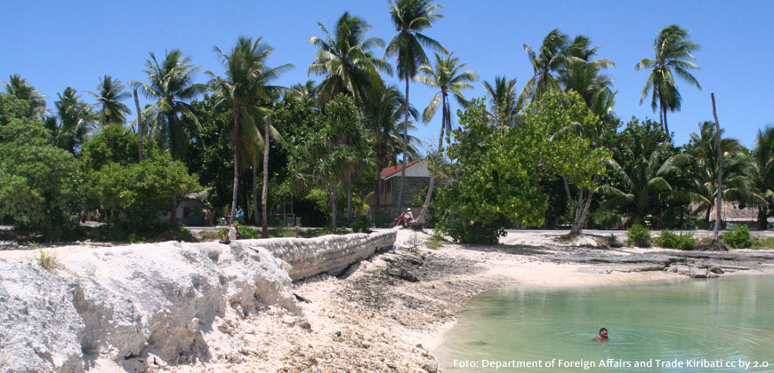 Kiribati, eine wenig bekannte Inselnation rund 2000 Kilometer südlich von Hawaii, ist ganz besonders von den Folgen des Klimawandels betroffen. Infolge des ansteigenden Meeresspiegels wird das Land spätestens 2050 unbewohnbar und 2070 vollständig überschwemmt sein – so die einhellige Prognose mehrerer Forscher. Bereits jetzt ist das Leben auf Kiribati mit erheblichen Problemen verbunden: Ein beträchtlicher Teil der Küsten ist erodiert – und die noch verbleibende Landmasse schrumpft immer weiter, sodass das Atoll für die rund 115.000 Insulaner jetzt schon zu eng ist. Das Meerwasser dringt zudem von unten in die Böden ein und versalzt das Trinkwasser. Da eine landwirtschaftliche Nutzung der Landfläche infolgedessen kaum möglich ist, können viele Lebensmittel nicht mehr selbst produziert werden. Um ihrer Bevölkerung eine Zukunft bieten zu können, bereitet die kiribatische Regierung daher jetzt schon eine Massenauswanderung vor und hat ein entsprechendes Abkommen mit den Fidschi-Inseln geschlossen. Mehr als 2.000 Hektar Land hat Kiribati von der fidschianischen Regierung erworben, um seiner Bevölkerung dort langfristig ein neues Zuhause zu schaffen.