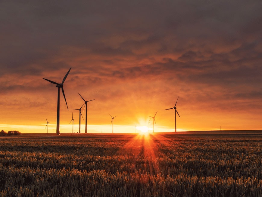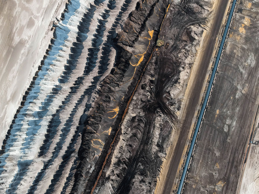 Foto links: Veränderung der Landschaft im Braunkohle-Tagebau Garzweiler, Tobias Jussen/unsplash; Foto rechts: Windpark, Karsten Würth/unsplash