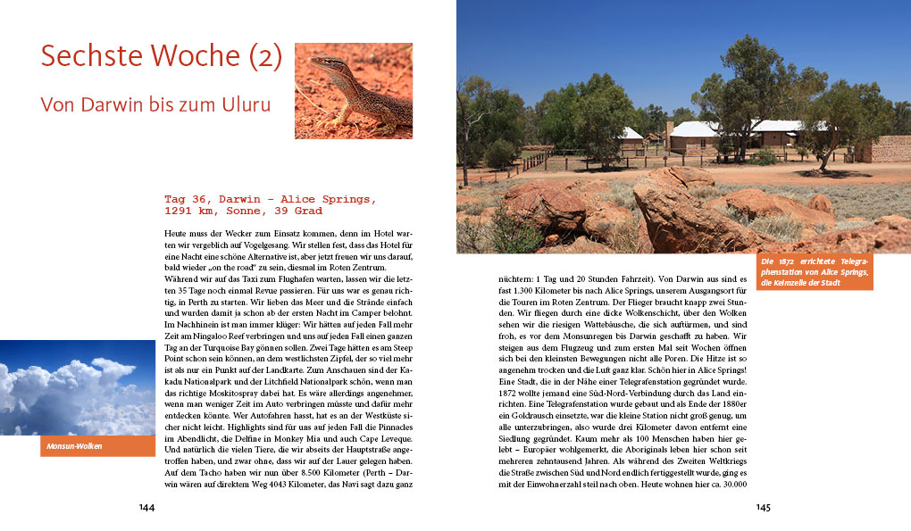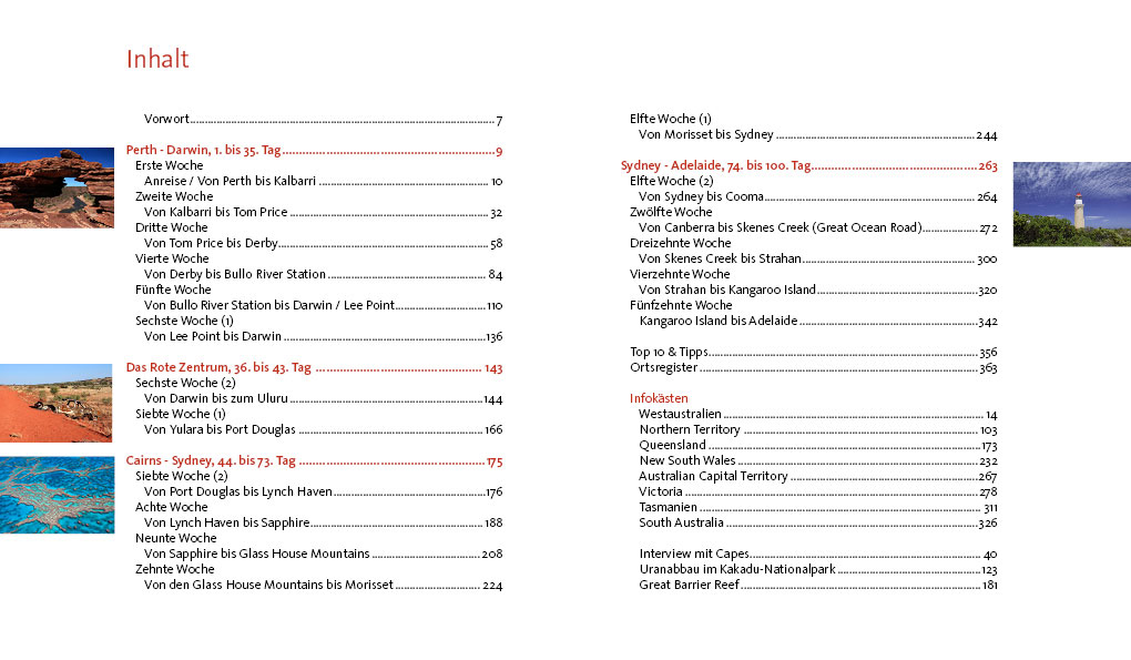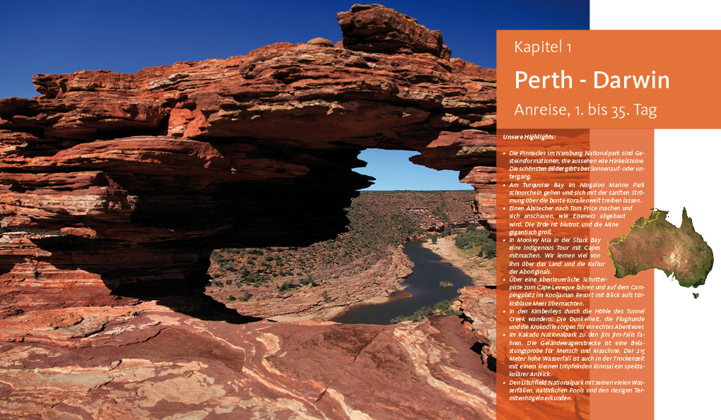 In einer gut gelaunten Mischung aus persönlichen Erlebnissen, Naturdoku und Reiseführer erzählen sie von ihrer Reise, die in Perth beginnt, die einsame Westküste hoch bis Darwin geht, über Alice Springs im Roten Zentrum bis ins tropische Cairns und von dort Richtung Süden über Sydney und Melbourne bis nach Adelaide. Sogar einen Abstecher ins ursprüngliche Tasmanien haben die beiden gemacht.