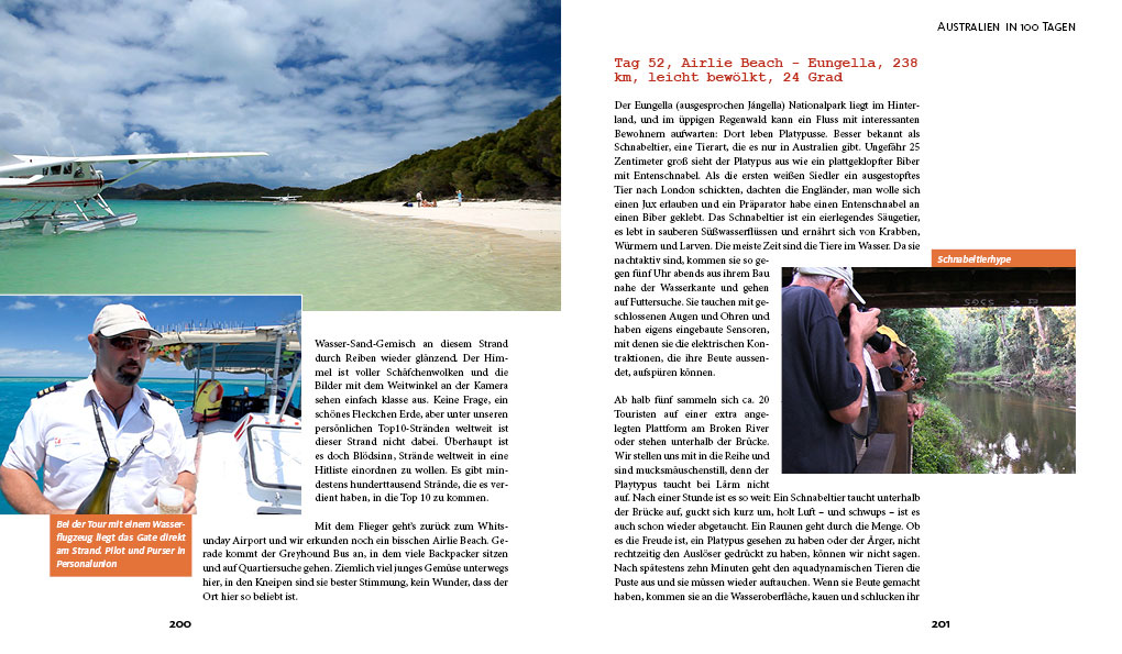 Der Unterschied zu normalen Reisedokus ist, dass jeder, der nach Down Under möchte, die Route aus Film und Buch praktisch nachreisen kann. In Reisebeschreibungen, wie man sie aus dem Fernsehen, von Reise-DVDs oder Bildbänden kennt, wird mit großem Aufwand eine künstliche Hochglanzwelt geschaffen. Silke Schranz und Christian Wüstenberg zeigen in Australien in 100 Tagen das echte Australien.