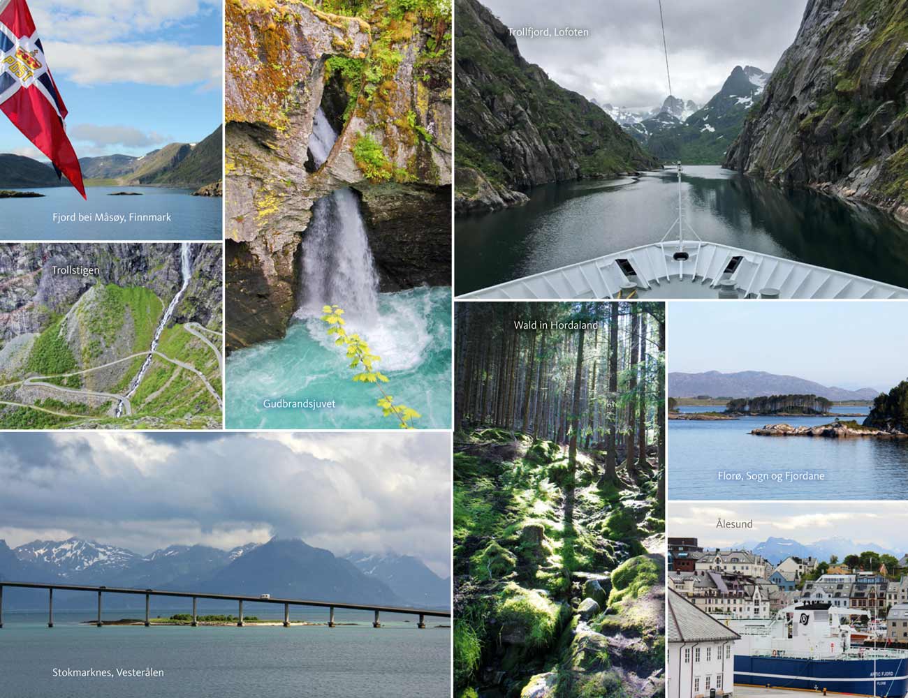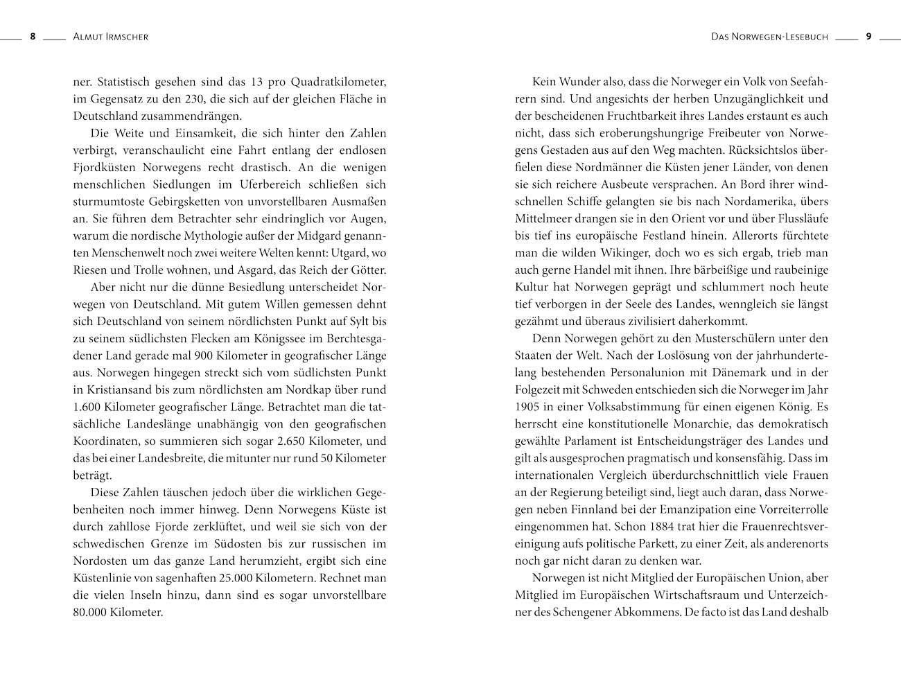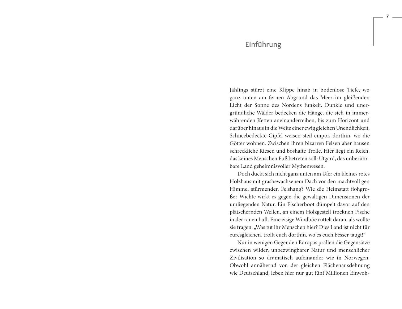 Norwegen – endlose Küsten, jäh aufstürmende Gebirgsgiganten, in bodenlose Tiefen abstürzende Schluchten, eine wahrhaft majestätische Natur, vor der wir Menschen so klein und unbedeutend sind. Tiefblau strahlendes Wasser, leuchtend rote Häuser, gleißender Schnee, die unermessliche Weite unberührter Wälder, windgepeitschter Ebenen und blanker, wulstiger Felsen – in Norwegen zeigt sich die erhabene Schönheit des Nordens. Mitternachtssonne taucht die geheimnisvolle Anderswelt in märchenhafte Farben, Polarlichter funkeln in der ewigen Nacht. Es ist ein magisches Reich, beseelt von rätselhaften Mythenwesen.