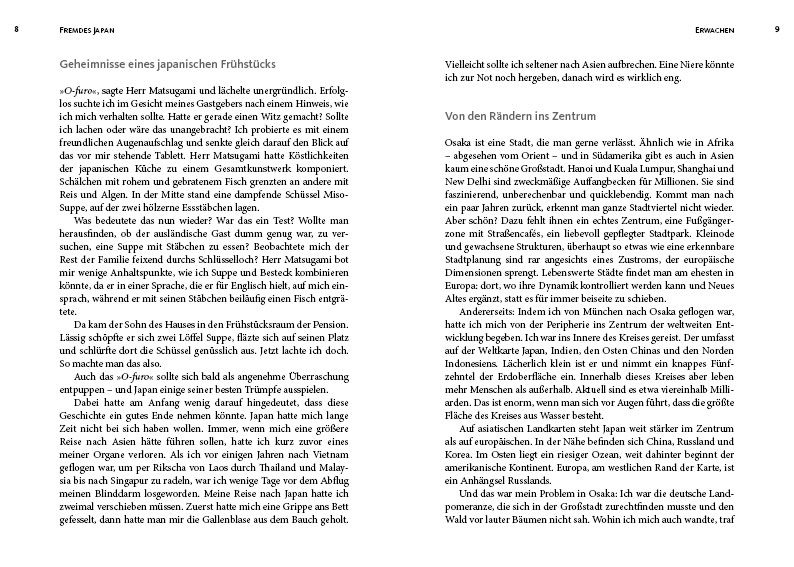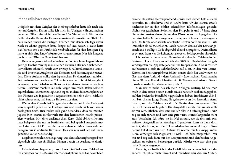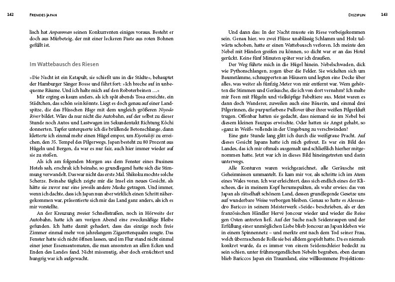 In Fremdes Japan aus der Reihe Abenteuer REISEN erzählt Thomas Bauer, wie er bewaffnet mit Hut und Pilgerbüchlein zu 88 Tempeln gehen will – und dabei tief hinein in die japanische Kultur und Mentalität gerät. Unterwegs trifft er entrückte Mönche und überschminkte Pilgerinnen, schweigsame Herbergsmütter und schwatzende Reisegruppen. Er verzweifelt beinahe an Essstäbchen, erfährt die ursprüngliche Bedeutung von Kamikaze und lernt, auf wie viele Arten man ein Lächeln falsch verstehen kann. Zwischen kaum nachvollziehbaren Regeln und echter Pilgerfreundschaft, jahrtausendealten Traditionen und hypermoderner Technik, zwischen buddhistischem Gleichmut und gnadenloser Geschäftstüchtigkeit lernt Thomas Bauer ein Japan kennen, in dem man sich rasch verliert.