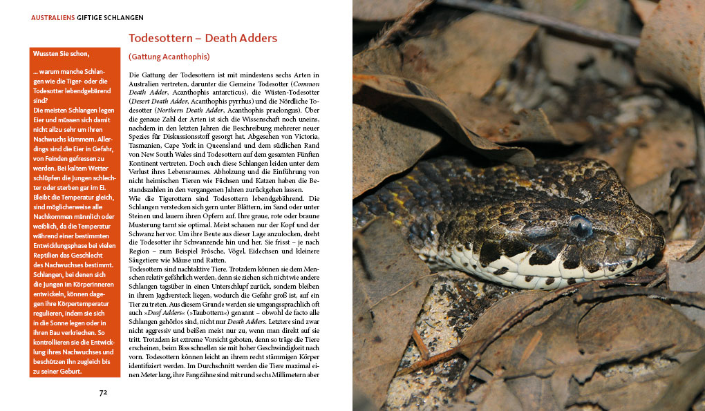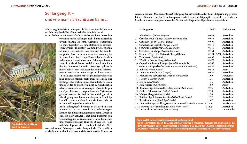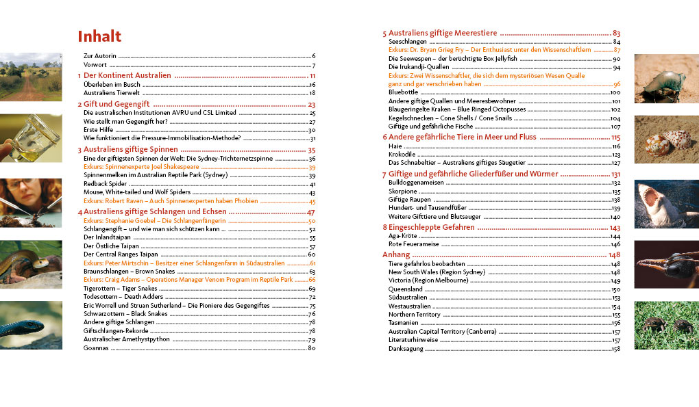 Daneben enthält das Buch aus der Länderhandbuch-Spezial-Reihe Porträts einiger furchtloser Forscher, die sich tagtäglich bei ihrer Arbeit in die Nähe der Tiere wagen, sowie Geschichten von dramatischen Begegnungen zwischen Menschen und Tieren, die nicht immer glimpflich ausgingen. Und für den Fall der Fälle erläutert die Autorin auch die jeweils geeignete Erste-Hilfe-Maßnahme …