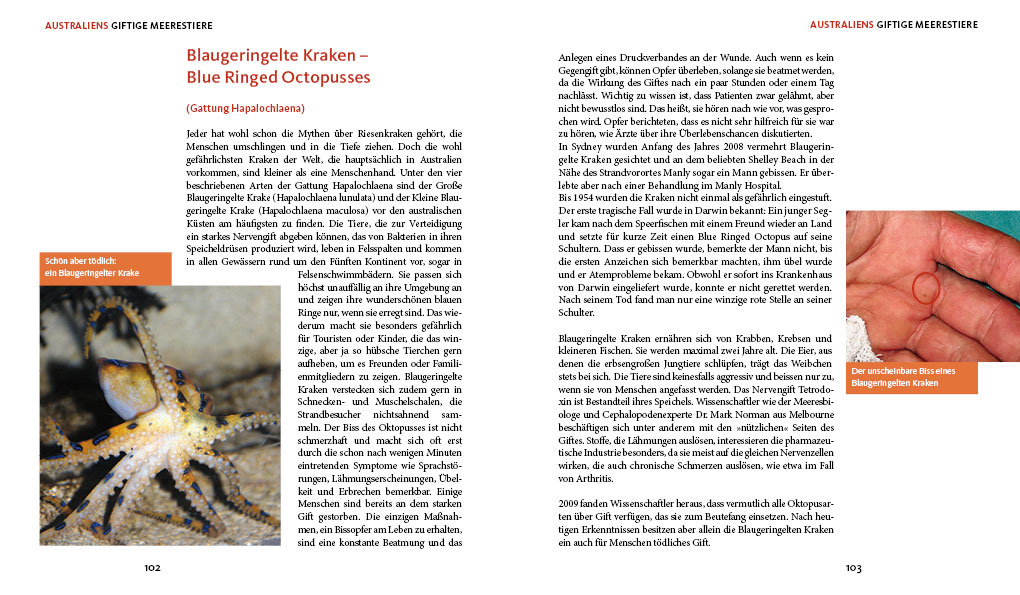 Australien, der Kontinent der Wunder und Extreme, wartet mit vielfältigen Reizen und Attraktionen auf. Neben atemberaubenden Naturlandschaften, kilometerlangen Sandstränden und dem weltgrößten Korallenriff gehören dazu auch viele der giftigsten Tiere überhaupt, die gefährlichsten und größten im Wasser lebenden Raubtiere und manch andere kleine und größere Lebewesen, denen mit Vorsicht zu begegnen ist.