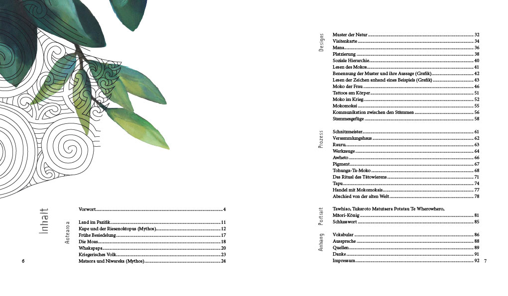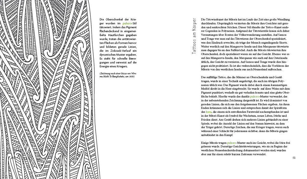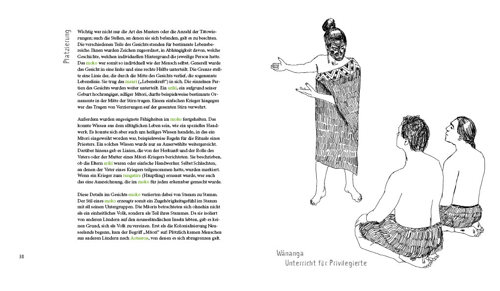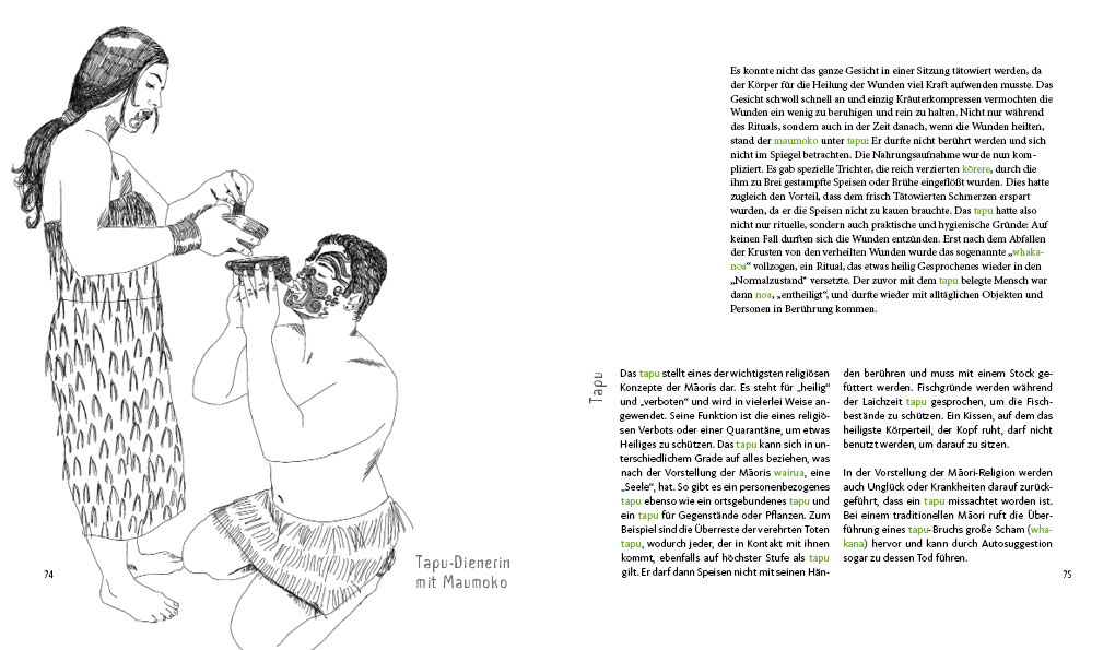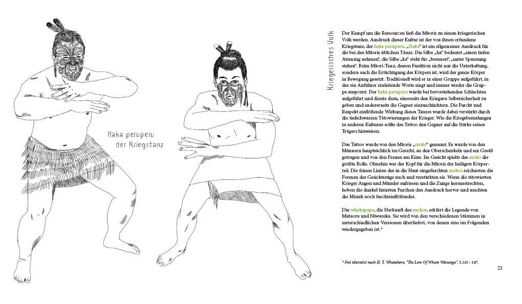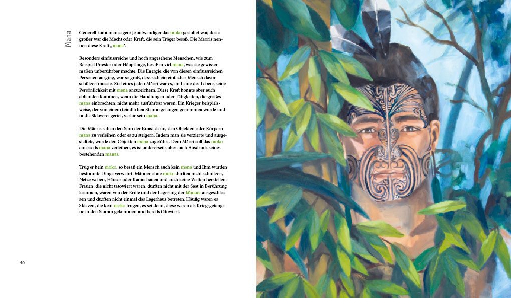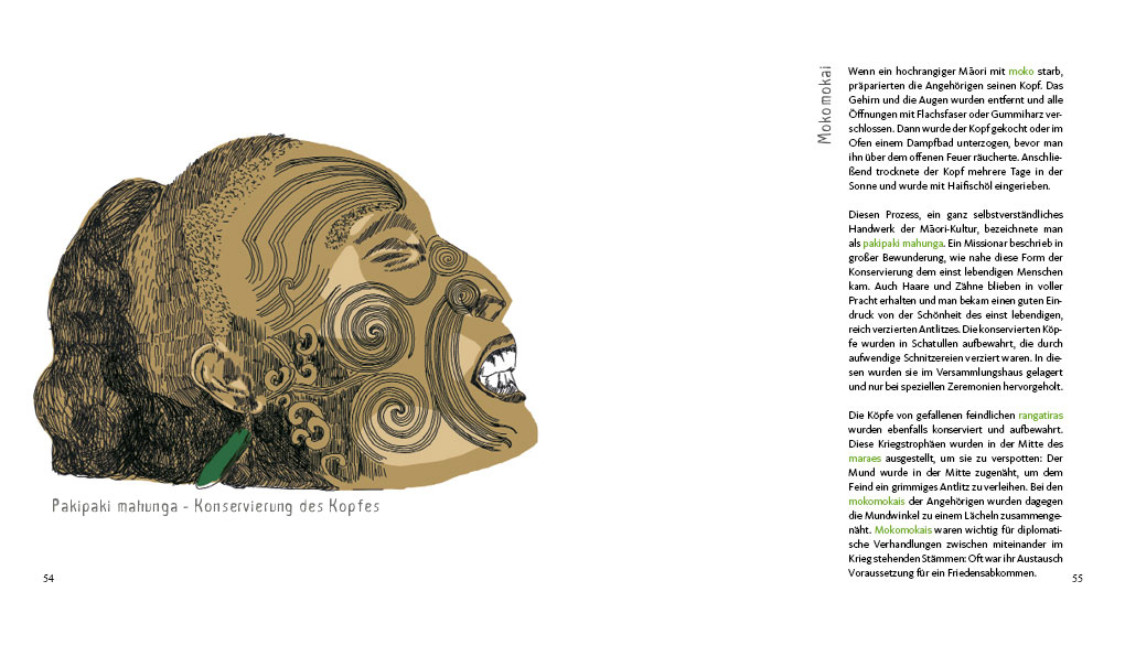 Auch die Illustratorin Mirja Loth wurde bei einem Studienaufenthalt in Neuseeland von dieser Faszination ergriffen. Auf der Grundlage von Begegnungen und Gesprächen mit Moko-Künstlern entstand ein Buch, das die Begeisterung der Autorin inhaltlich und optisch unmittelbar an den Leser weitergibt. Erschienen istz das Buch in der Reihe „Länderhandbuch-Spezial„. Das Thema der sprechenden Bilder wird umgesetzt durch eine besondere Verbindung von informativen Illustrationen und visuell darauf abgestimmten Texten. So werden Informationen über historische und kulturelle Hintergründe, den Ursprung, die Formen und die besondere Technik des Tätowierens vermittelt und zugleich Mythen und Legenden erzählt, die die Grundlage für die Kultur und Denkweise der Maori bilden.