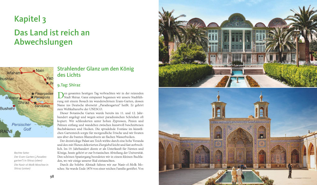 Renate Eisfelder-Seitz wanderte auf kulturhistorischen Spuren und besuchte einzigartige Paläste und Gärten, die nicht nur wie das Paradies von Erden wirken, sondern auch von der UNESCO als Weltkulturerbe anerkannt wurden. Sie tauchte tief in die jahrtausendealte Geschichte des Irans ein und ließ sich von der abwechslungsreichen Landschaft und der gastfreundlichen Bevölkerung verzaubern.