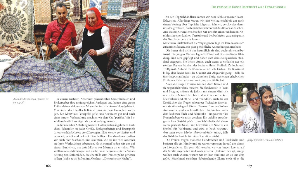 Ihre überwältigenden Eindrücke hat sie in dem bildreichen Länderhandbuch Reise in den Iran festgehalten. Die Lektüre wird jedem gefallen, der mehr über das Land, dessen Bewohner und dessen Kultur erfahren möchte und der bereit ist, manche Vorurteile neu zu überdenken.
