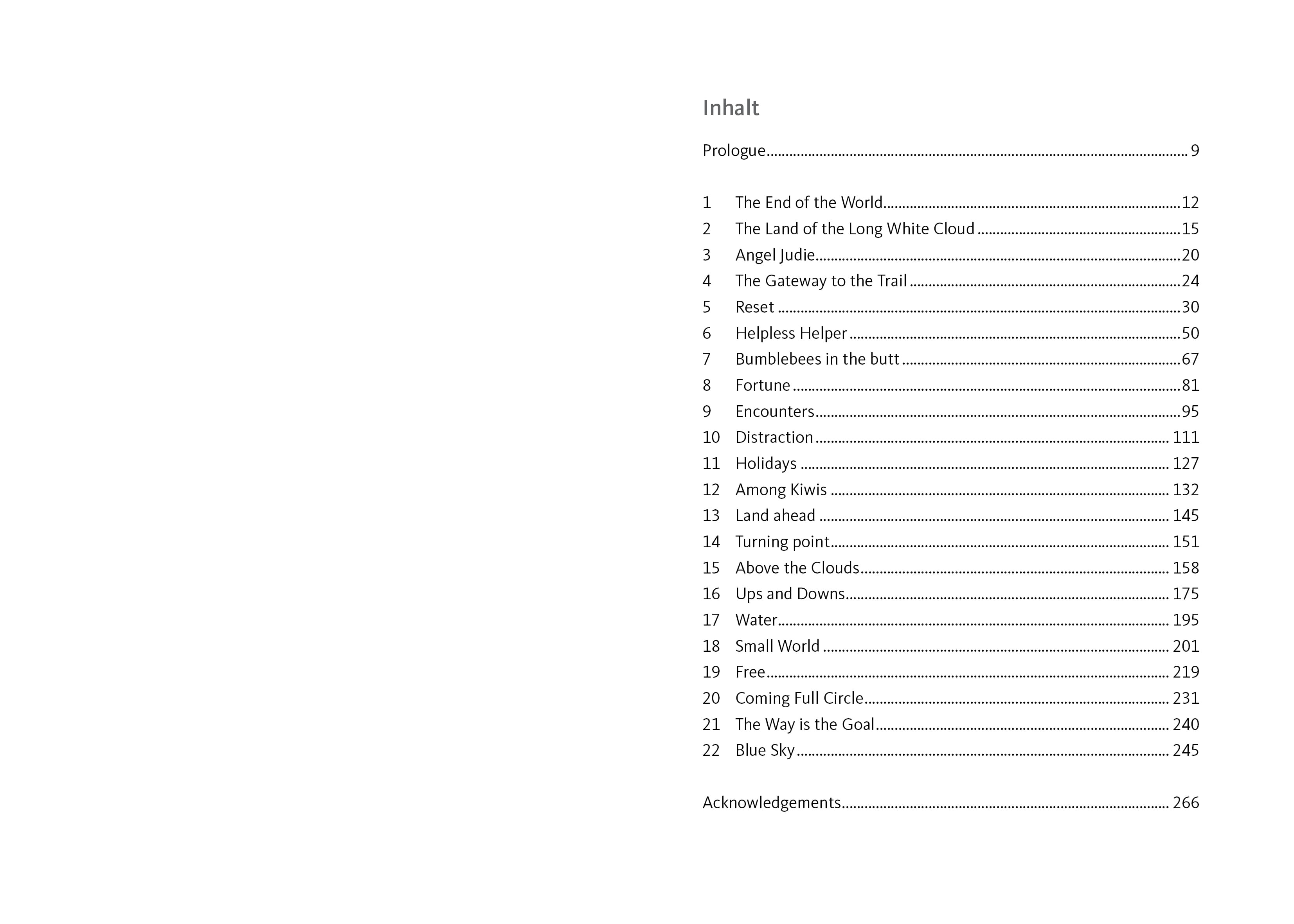 Through knee-deep mud, torrential rivers, narrow gullies, along sharp ridges and endless beaches she walked through the wilderness of New Zealand. Te Araroa – ‘the long pathway’ – became her home for five months. She carried everything in her backpack that she needed for living. Dangers and the deprivation of any luxury slowly shook her numb mind back awake. The breath-taking nature, the wonderful country and special encounters helped her to process what had happened and to come back to herself step by step. She re-discovered the long lost joys of laughter and learned to enjoy life once more.
